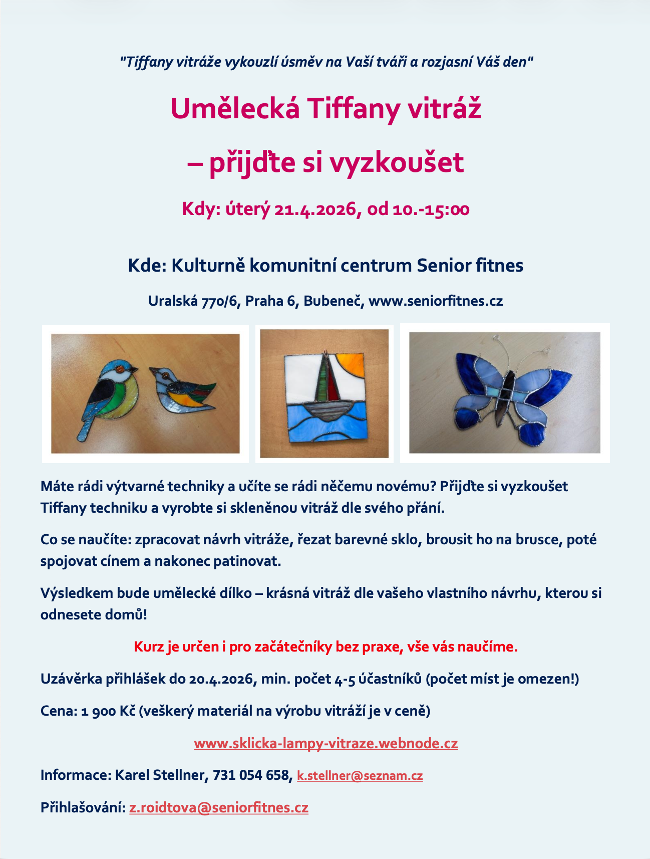 Cena: 1 900 Kč (zahrnuje veškerý materiál na výrovu vitráže, kterou si pak odnesete domů)